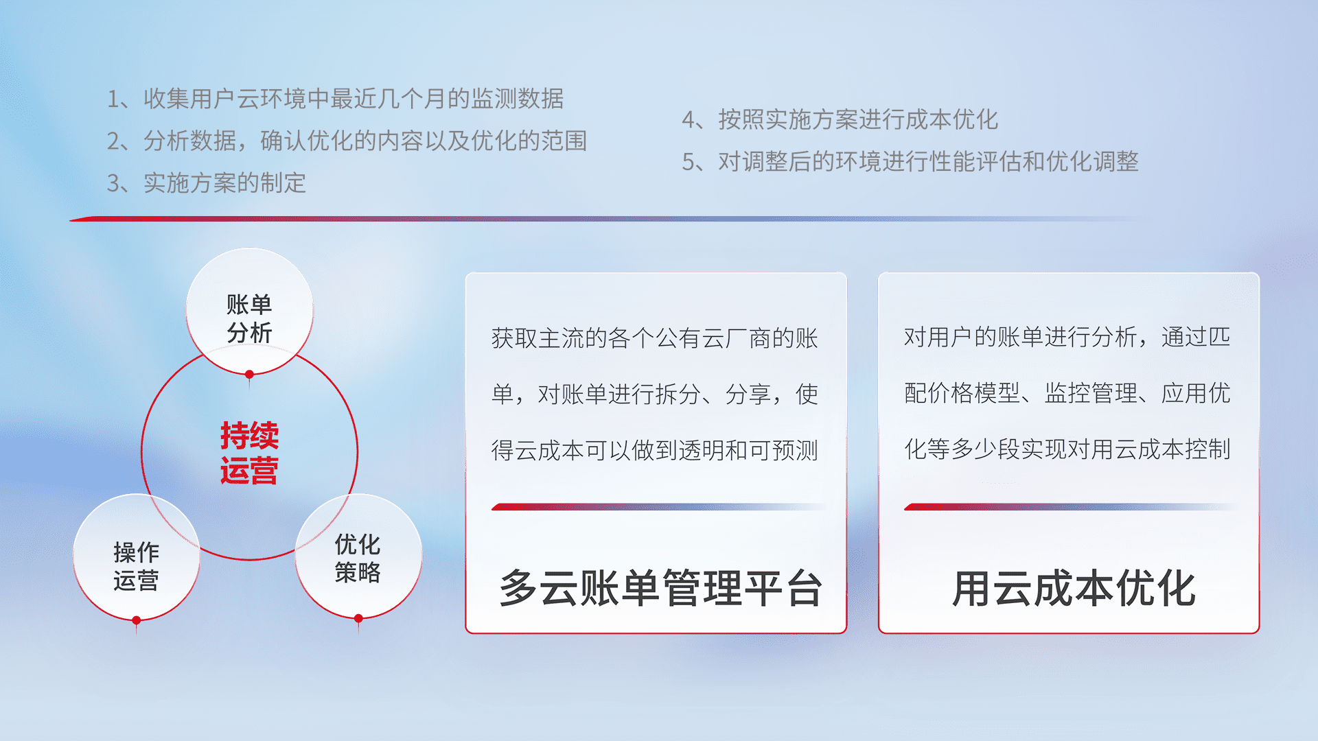 通过多云纳管,,,,以统一的资源数据模型把客户的云资源进行抽象和封装,,,,进而实现对多云资源的统一操作,,,,保障云资源管理的可靠性、、、稳定性与可用性。。量身定制化运维内容,,配置、、、、开发运维、、、、补丁管理、、、备份、、、、监控、、、认证和访问管理、、审计和日常巡检等,,,保障在用云过程中的可靠度,,,,稳定度以及高可用率。。。。
